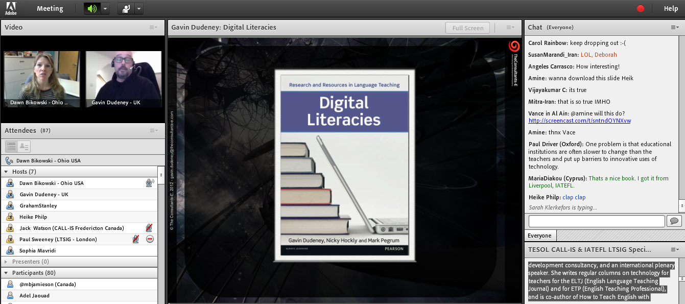 There was also a short interview with Dawn Bikowski, who volunteered to moderate and who was one of the developers of Trace Effects, a free language learning game created by the US Government, http://americanenglish.state.gov/trace-effects
