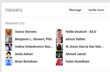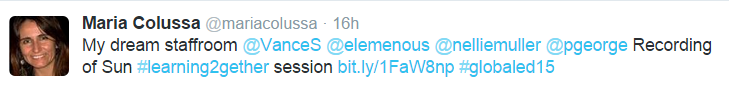it is worth doing!! It is my CPD on line Nives: Hi Tiziana 🙂 Susan: Aloha Everyone! Not sure how long I can be here. Bad internet and on a chromebook. Sound not very clear but slides are GREAT. Dr. Nellie Deutsch: Nives, ‘m sharing link with you Peggy: time zones can be so confusing! I rely on timeanddate.com to help me! Tiziana: Hi NIVES! HI PEGGY!! Peggy: Hi Tiziana! Great to see you! Nives: Thank you Dr Nellie Dr. Nellie Deutsch: Peggy, I also use timetable links Nives: Brian is trying now Peggy: https://plus.google.com/u/0/communities/109504049211076695836 Dr. Nellie Deutsch: Nives, the link is for one person Tiziana: Hi ! PLESED to be on line and learn from so many communities on line which are really engaging!! Dr. Nellie Deutsch: Hi Brian Nives: Ok Dr Nellie no problem Brian B: Hi Dr Nellie Dr. Nellie Deutsch: Let me know if your friends need a unique link to come in Peggy: I don’t know how Vance keeps up with so many networks but he is amazing!!!! Peggy: http://webheadsinaction.org/live Brian B: Thanks for the link Dr Nellie Nives: Great to see you here Brian … no idea how long this will last but let’s enjoy it while we can 🙂 Peggy: http://chatwing.com/vancestev Tom: Nives, do not leave the session. It’s a continuous class, all day long. Nives: There are many ways to have BackChannel chats when not all can join a HOA Nives: Thanks for letting me know TOM 🙂 Brian B: Its taken along time to get here so I will not be leaving yet. Peggy: http://tesl-ej.org/pdf/ej67/int.pdf Nives: Good Brian let’s hang out here today 🙂 Peggy: Chatwing helps you to feel connected with other people in the same event 🙂 Rob Howard: Good question Nives: Dr Nellie – what will happen with people following the Twitter or FB links which are not working ? Nives: Hi Rob 🙂 Rob Howard: Hi Nives! Dr. Nellie Deutsch: good question Nives: I agree Peggy – chatting during an event in a backchannel keeps (me) motivated and engaged. Dr. Nellie Deutsch: Nives, you can tell them to register Peggy: love that description! you know it’s working when you’re learning new things is when your practice changes 🙂 Nives: Register … I did that and it did not work…! Dr. Nellie Deutsch: Maybe the link I shared will work for them if they add their names Peggy: yes Nives! I find that if there is no way to chat during webinars it’s easy to get up and walk away and get distracted. 🙂 Nives: Let’s hope so Dr Nellie Dr. Nellie Deutsch: Smore is more Dr. Nellie Deutsch: http://tinyurl.com/vance2015fbf Peggy: Thank you Vance for all you do to bring these amazing professional learning experiences to all of us through Learning2gether!!!!! Nives: Yes Peggy or do something else on another page and not really ‘pay attention’ just listen passively Peggy: exactly Nives! Nives: 🙂 @Peggy Peggy: you can’t get the link with your name unless you register. That’s how I finally got it. Nives: Will the recording also have the same problem Dr Nellie when trying to access it ? Rob Howard: I hope we learn! Peggy: good question Nives 🙂 Nives: Peggy I did register twice with 2 diverse emails and still no luck until magically it just happened… Rob Howard: Very positive! Nives: I think we always learn as long as we experience something, no? Nives: Or at least I do … Peggy: will the recordings for these sessions be separate recordings for each session or one long recording? Peggy: sorry Nellie. Not prepared to take the microphone today. Tom: Going to grab a cup of tea! Dr. Nellie Deutsch: One long one and my Youtube for each one Peggy: we did a show yesterday that was a preview of the K12 Online Conference. The recording and Livebinder links are here: http://live.classroom20.com/archive-and-resources/k12-online-conference-preview Peggy: thanks Nellie Peggy: what is the url for your youtube channel? Dr. Nellie Deutsch: I think it will work, Nives Nives: Oh good idea YouTube one for each Dr Nellie – I will rely on those recordings. Peggy: Thank you Vance for this great presentation! Tom: Thanks Vance! Dr. Nellie Deutsch: https://www.youtube.com/playlist?list=PL8JUcjyABKxnNx8kpdaBkmTcFEP9shyi9 Peggy: I guess Vance can’t see our chat today Peggy: thanks Nellie!!