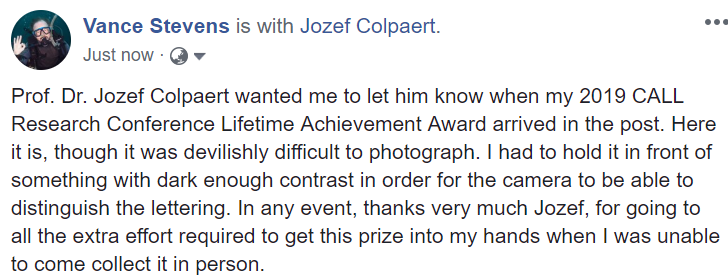 2019-08-05_fbpost August 5, 2019 at 728 × 279 in Vance Stevens receives the Lifetime Achievement Award for 2019 at the CALL Research Conference in Hong Kong ← Previous Next →