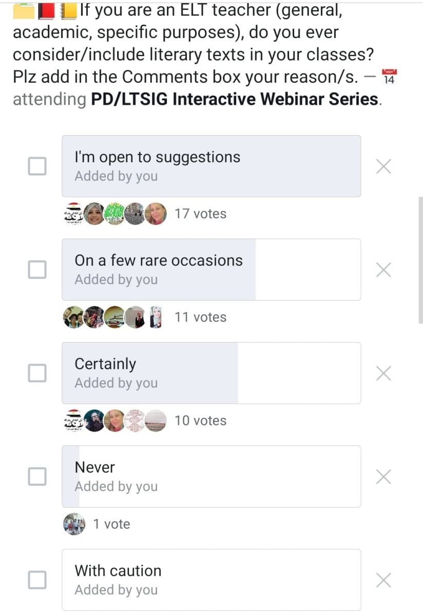 2019sept28poll September 30, 2019 at 1080 × 1572 in Nile TESOL LTSIG Webinar – Hanaa Khamis interviews Lilika Couri on whether or not to teach literature ← Previous Next →