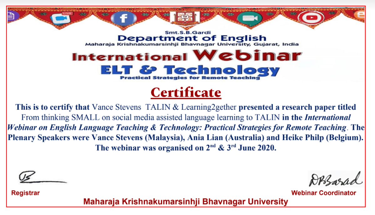 2020-06-06_1033ELTcon_cert June 6, 2020 at 1263 × 723 in Vance Stevens presents from SMALL to TALIN at the Online International Webinar on ELT & Technology ← Previous Next →