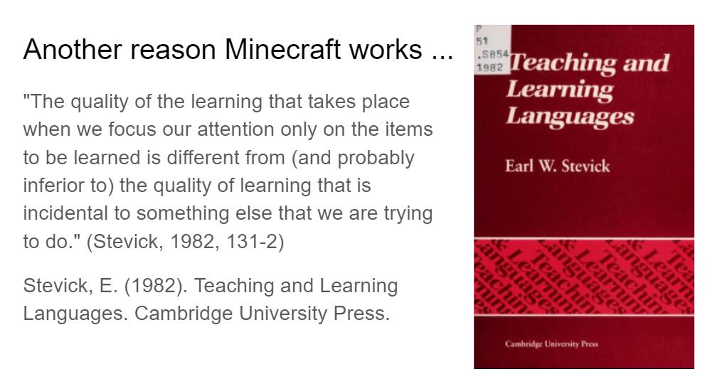 In the EVO Minecraft MOOC Best of EVO and Tour video there was a lively discussion of the benefits of using Minecraft with language learners. I made a transcript of the parts relevant to language learning from the closed captions and placed it online here: https://docs.google.com/document/d/1M5NrEH9_6O37o9BnOnUUbFL1jtcBYLoqRJxMvgD3RZQ/edit?usp=sharing,