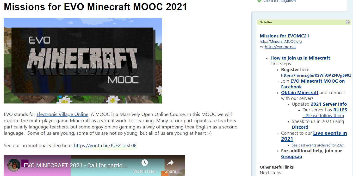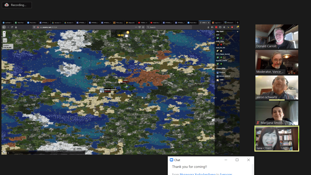 This was a big day for EVO Minecraft MOOC at the TESOL 2021 Virtual Conference. We presented a Best of EVO presentation at 10:30 a.m. EDT followed by a tour of the EVO Minecraft MOOC server at 11 a.m. We had planned the tour to begin with a discussion at first, so at 11 a.m. EDT we just carried on talking. But we were asked to stop there to make a correct break between our Best of EVO session and the server tour, which we had been expected to record in a new video.