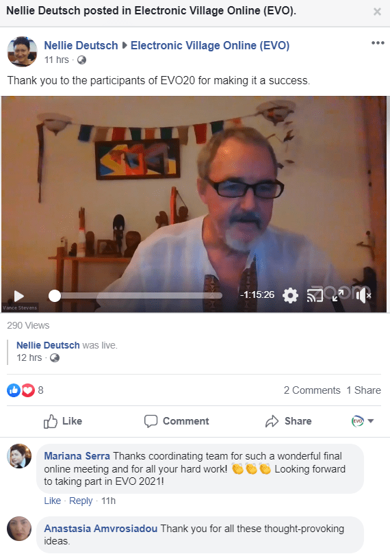 On Sunday, February 16, 2020, at 14:00 UTC, Electronic Village Online, http://evosessions.org, held its annual wrap-up and closing ceremony, this time for EVO 2020. The session was run by Carolina Buitrago and Martha Ramirez, our Head Lead and Lead Coordinators for EVO 2020.