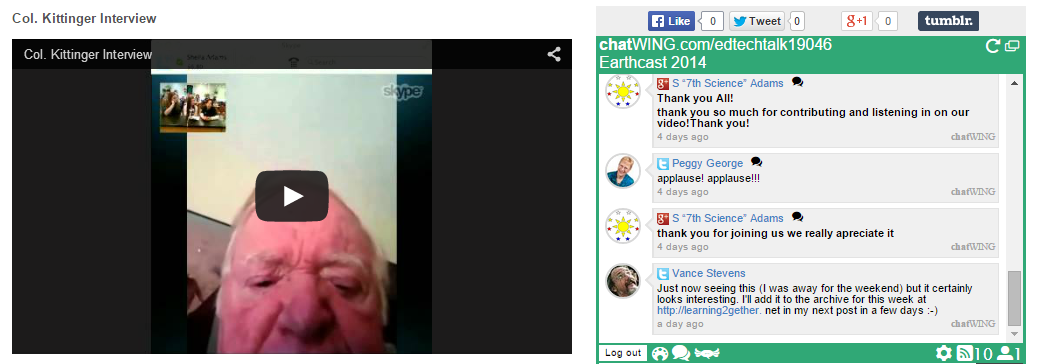 Thu Jan 29 Earthbridges interviewed Col. Joe Kittinger in Hangout for classrooms around the USA